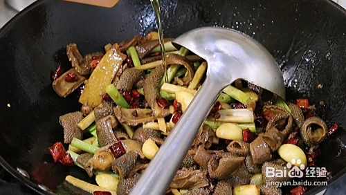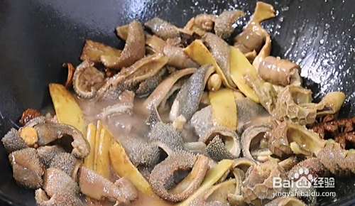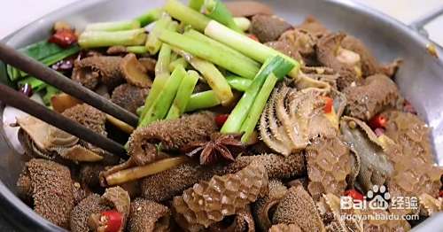 热锅烧油,下入焖煮好的羊肚,加入剩下的酱料,翻炒均匀。