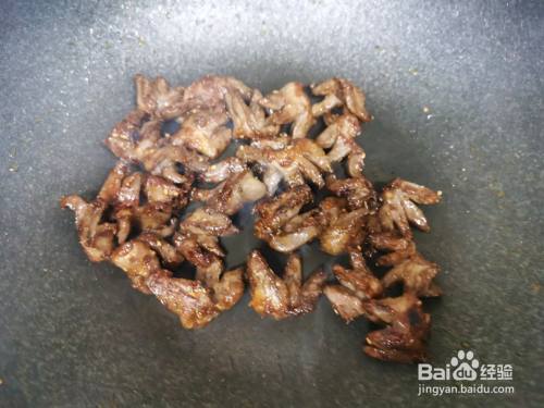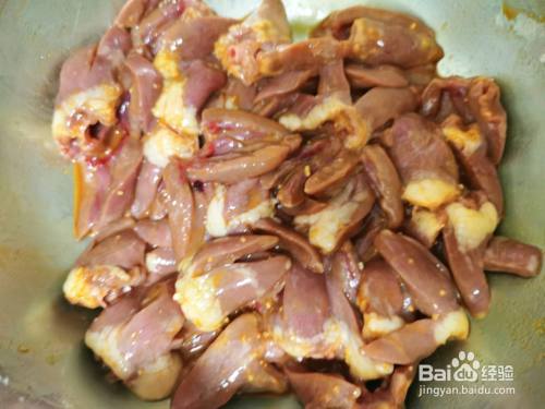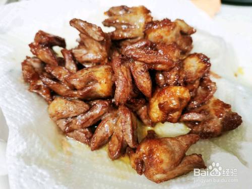 干锅,不放油,热锅后把鸡心放进去,加入少许盐,辣椒粉,孜然粉,芝麻一点点,干煸几下,调料裹匀了就可以出锅