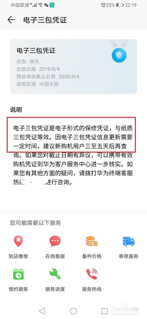 第五步需要注意的是如果新购买的手机,看不到保修信息,可以等三到五天再来看,电子三包凭证信息更新需要一定时间