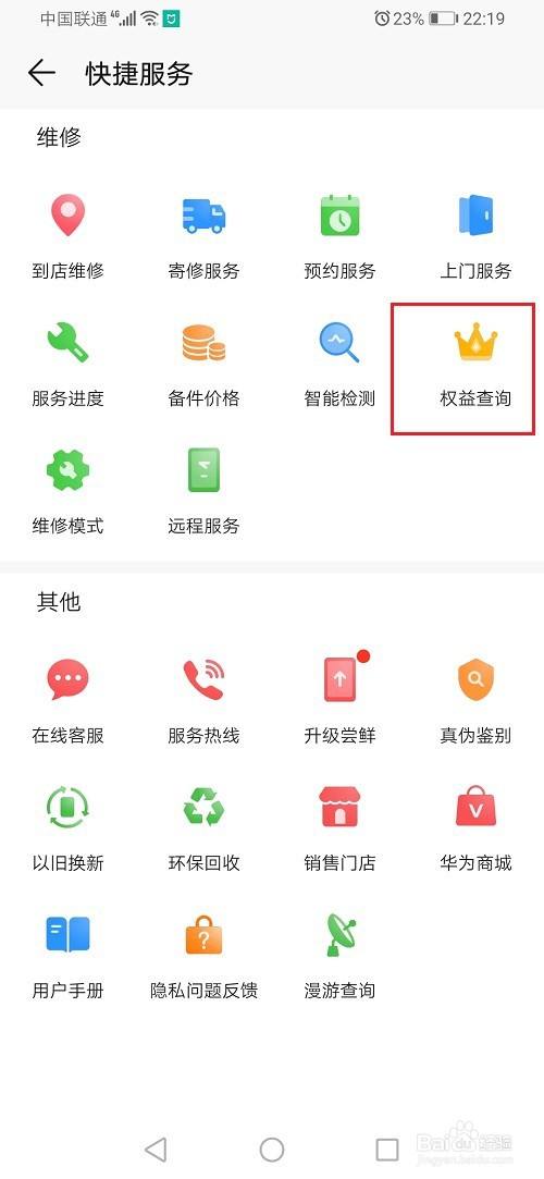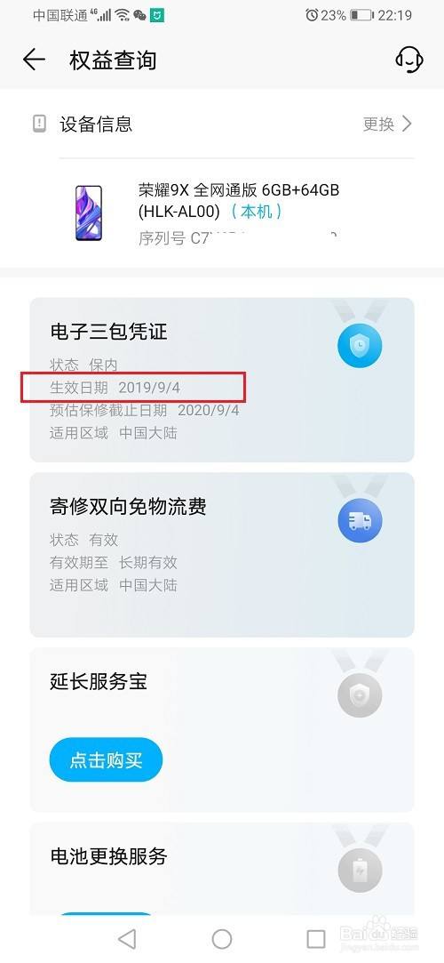 第四步在华为荣耀手机权益查询界面,可以看到保修的生效日期,这个就是华为荣耀手机的激活时间