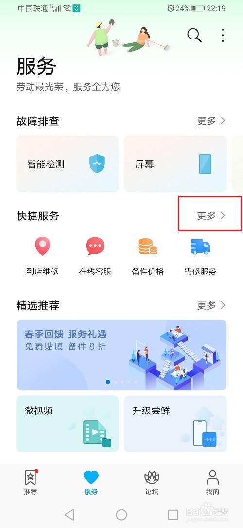 第二步在华为荣耀手机服务界面,点击快捷服务的更多