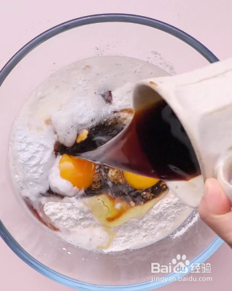 再将鸡蛋,红糖水放入碗中,搅拌均匀