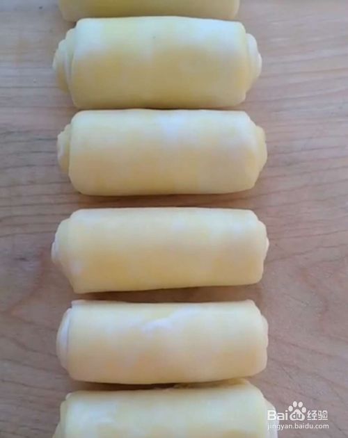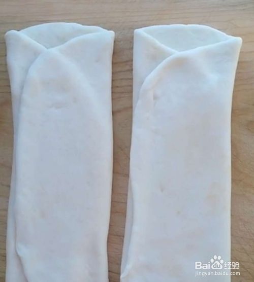 把面卷的一端立起来,中间按进去,放入糖馅。