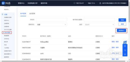使用主账号登录商家后台,点击“店铺”下的【子账号管理】,选择【新建账号】。