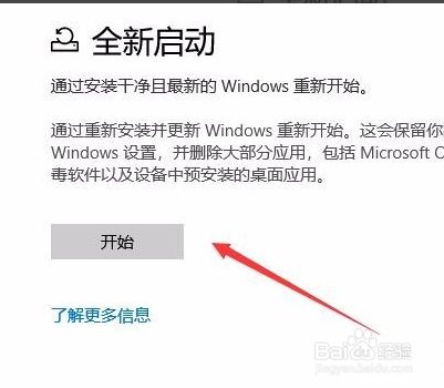 在右侧新打开的窗口中,就可以看到全新启动功能了,点击“附加信息”快捷链接。这时就会打开全新启动的窗口,点击“开始”按钮。