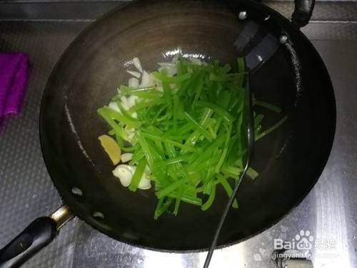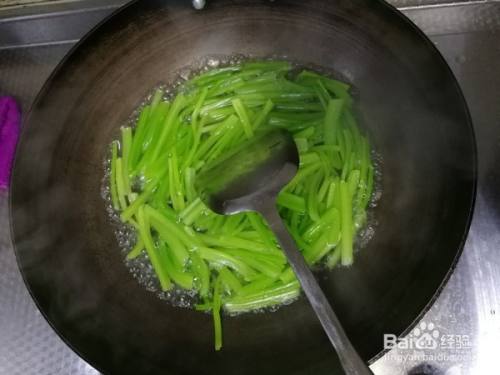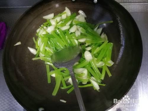 百合翻炒1分钟后倒入西芹,继续翻炒。