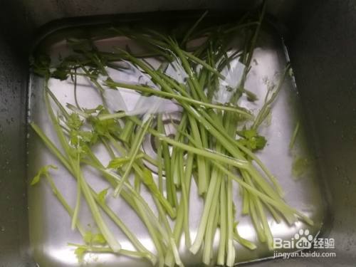 准备一把西芹摘去叶子,去底部老根,留茎杆部分。
