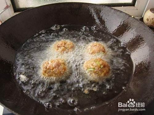 五层油温狮子头下锅炸,炸至两面金黄捞出。