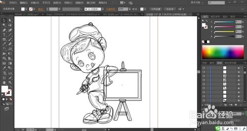 先用钢笔画出小画家的基本轮廓,我们重点绘制小画家的头发、眼晴、服饰、画笔与画架,还有双手与双腿的动作轮廓。