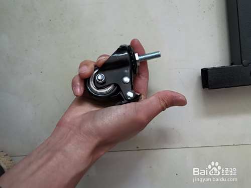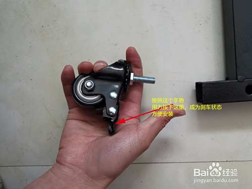 自行购买了万向轮,按下轮子后端的刹车位置,用力按下变成刹车状态,然后 拧入预留螺纹口。(如果没有购买轮子请跳过这一步骤)