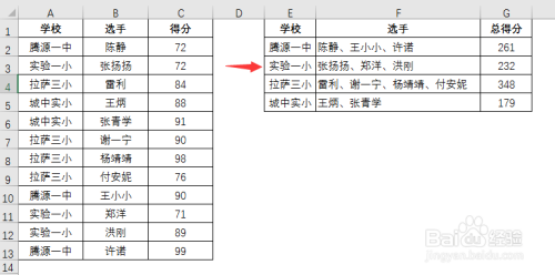 使用此方法,不仅可按学校汇总所有选手,还可汇总所有选手的得分,如下:
