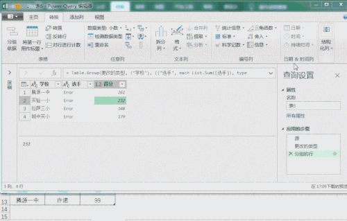在【转换】选项下,点击“分组依据”,之后选择“高级”,再设置按选手和得分进行分组求和,即可完成。