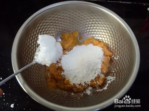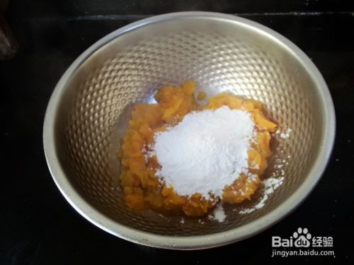地瓜泥放入大盘,放入适量糯米粉,(糯米粉要分几次加)