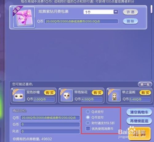 根据自己的需求把要买的加入购物车,(现在我以月费包裹做示范),结算时根据自己的情况使用Q点、Q币等等购买。然后结算。