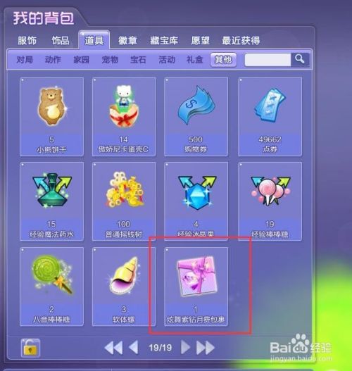 然后在自己的背包-道具-其他里面找到刚刚买的包裹。左键双击使用,会得到一张紫钻月费卡。