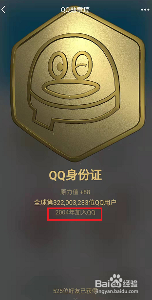 在勋章界面,点击【QQ身份证】勋章,这时,即可查询个人QQ注册时间。