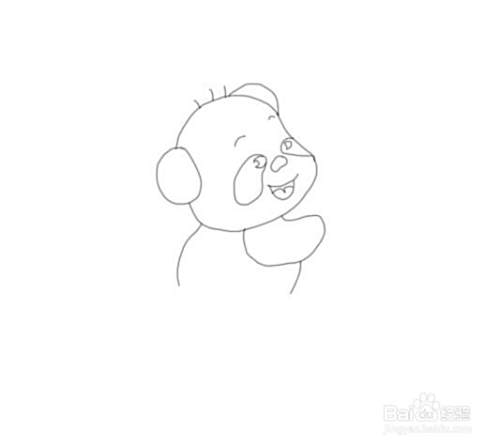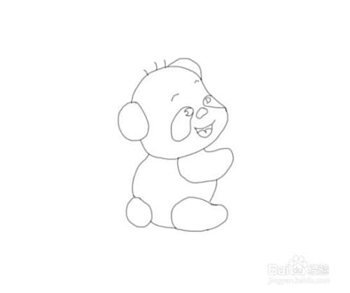 再在画好的头部的下面再画出熊猫的身体,然后再画出下面的一只胳膊,如图所示: