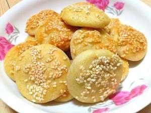 将和好的面团揪成小季子,搓成圆球,在手心稍微按扁,放在烤盘上。表面刷全蛋液,撒上芝麻(也可以将饼表面在蛋液过一下,蘸芝麻,会更匀称)
