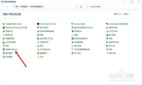 打开电脑控制面板,点击网络和共享中心。