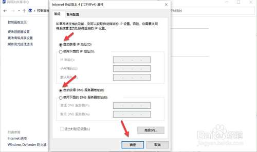 将IP地址和DNS服务器地址全部改为自动获取,点击确定。