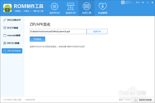 打开ROM制作工具,选择实用工具-ZIP/APK签名,选择任意ROM/APK文件