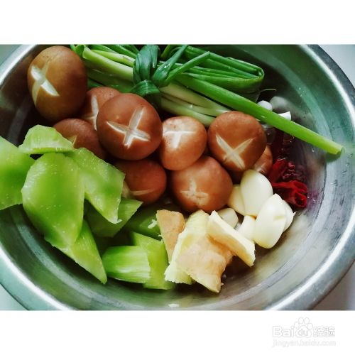 准备好所有配料,鸡块飞水后清水清洗干净,香菇切花刀,青笋滚刀切,姜整块拍一下就好。