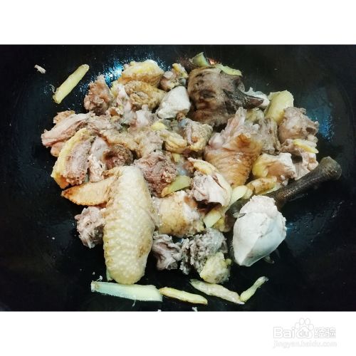 热火凉油中放入姜片炒香,然后放入飞过水的鸡块,炒干水分盛出