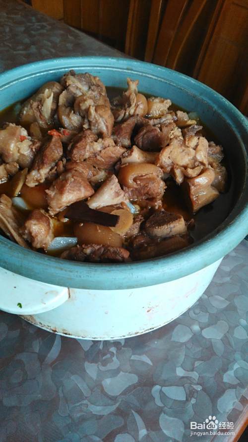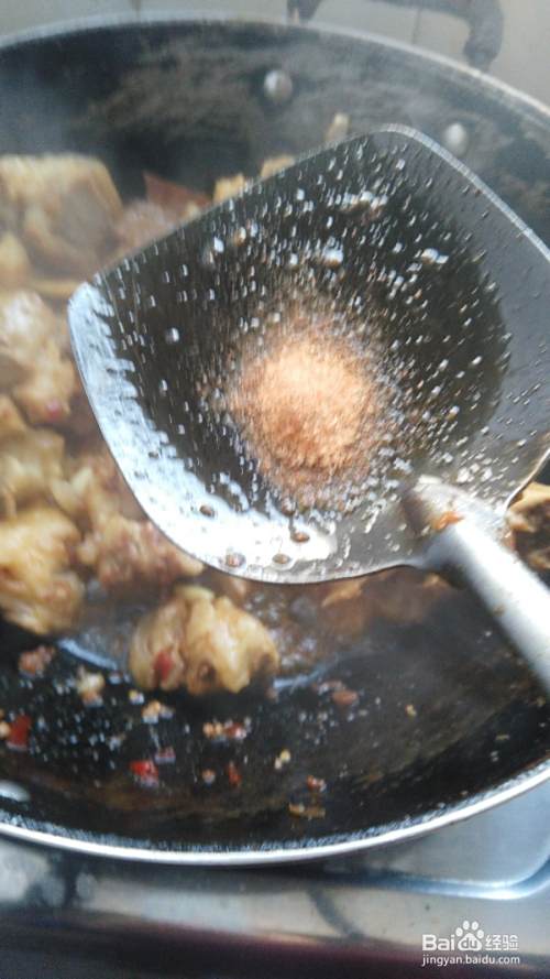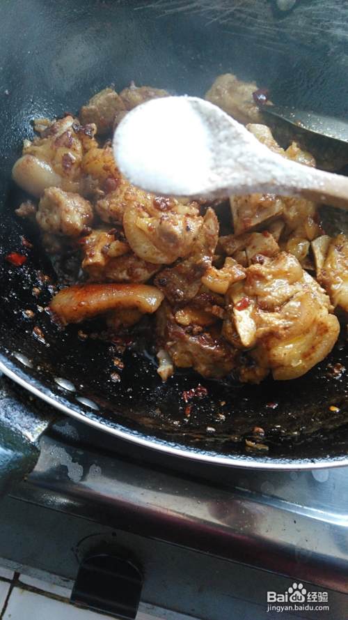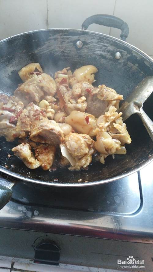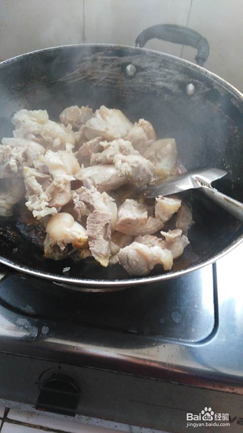 反复翻炒,让猪蹄水气变干,同时炒入味;
