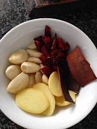 将姜蒜桂皮干辣椒等调料洗净切好备用;