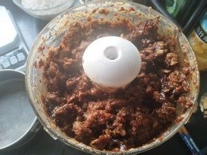 用搅拌饺子馅(家里没有料理机)的搅拌成泥状,搅拌过程慢慢倒入牛奶,弄好的红枣泥放一边。