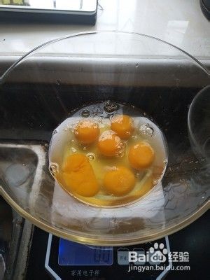 6个鸡蛋打到大的碗里(一定要大的碗,后面所有材料都要放进去),把碗直接放在厨房秤上,使用清零功能。依次放进去红糖80g,白糖30g,小苏打8g,盐2g。