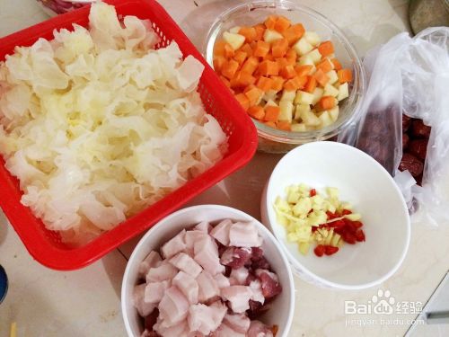 土豆、胡萝卜(长豆角亦可)、五花肉洗净切丁,姜蒜切片或丁(银耳是我用来做银耳红枣羹的)