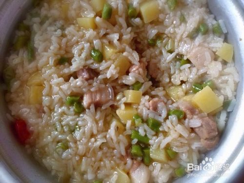 电饭煲内:米和水的比例按照平日里煮饭一样就行,倒入翻炒好的土豆胡萝卜五花肉,尝一下盐是否适中,按煮饭键即可等待成功。