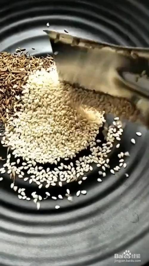 在碗中放入孜然,芝麻 ,辣椒粉,烧烤料,撒一点儿盐。