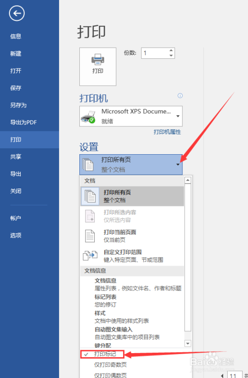 找到【设置】,点开【打印所有页】后面的下拉列表,找到【打印标记】,取消掉前面的对勾勾选。这样打印预览和打印都不会显示标注、批注了。