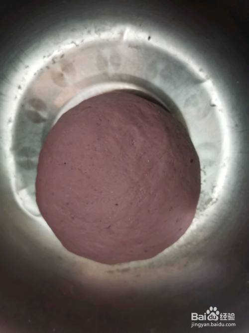 发酵好的紫薯面团,搓个孔不回缩就代表发酵好了,取出排气,整形