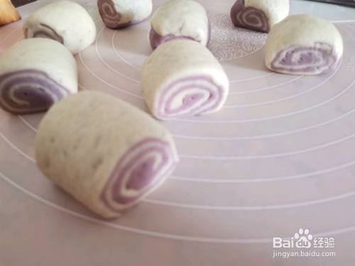 发酵好的白色面团,紫薯面团分别排气,整形。擀成薄片,刷油,白色在下,紫色在上,卷起