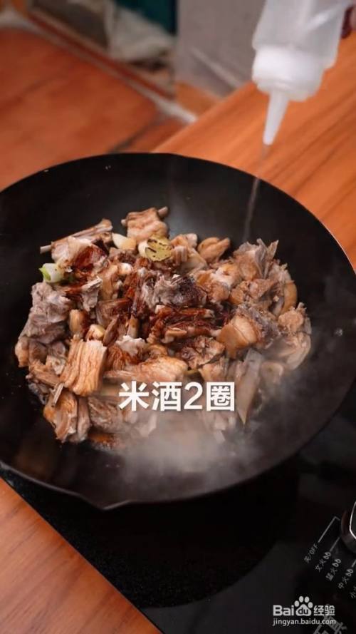 铁锅少油,下入葱姜蒜爆香,下入羊排,桂皮,八角,孜然,冰糖,一同炒香后放入生抽三勺,老抽半勺,米酒两圈,翻炒均匀加胡萝卜块