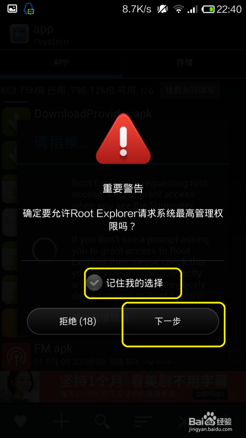 然后,我们打开re管理器。如果出现如图所示的界面,要求是否允许 ROOT,我们选择记住,并且是,一直下一步操作,即可。