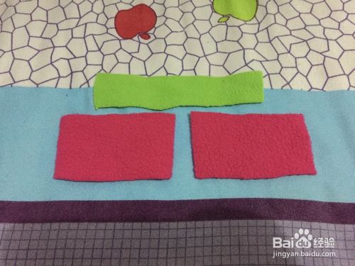 准备2块玫红色面料4*3公分,1块嫩绿色面料8*1.5公分。