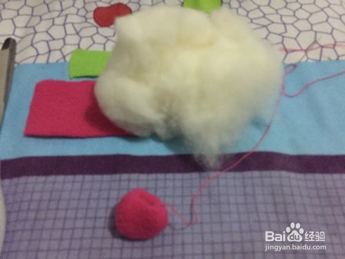 将棉花扯出一缕用小镊子塞入球,直到塞满棉花后进行缝口。另一个小球也按如此方法进行制作。