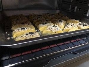 面团切成三角形,再撒一点点黑芝麻做点缀。放入烤盘,烤盘提前抹点油。