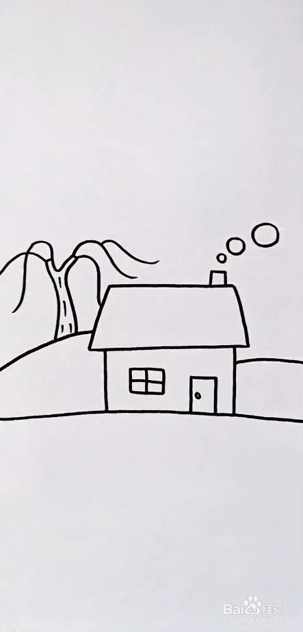 首先画出小房子,然后把大地勾勒出来,在画出柳树。