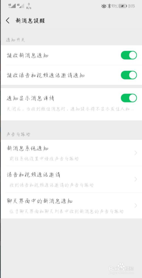 打开消息通知后,我们可以看到其中又接收新消息通知,以及通知显示消息详情等等,我们将显示消息详情关闭,打开接收消息通知即可。