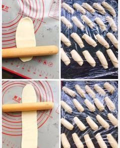 3、将松弛的牛舌状面团擀成长条,卷成小桶形状,收口朝下,松弛15分钟。这一步,你擀的长度越长,决定你的蛋黄酥最终有多少层酥皮。如上图下半张