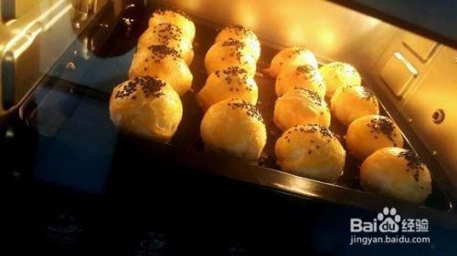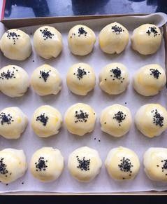 5、包入准备好的豆沙蛋黄,收口朝下放入烤盘中。这一步没人帮我拍