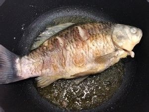 起锅烧油,等油热后下入鲫鱼煎,煎至底部定型后再翻面煎,煎至两面金黄后盛出