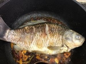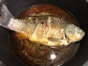 放入鲫鱼,加料酒 生抽 老抽 醋 糖