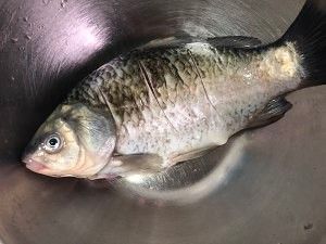 鲫鱼清洗干净,肚子两面划上两刀,摸一层盐腌制半小时