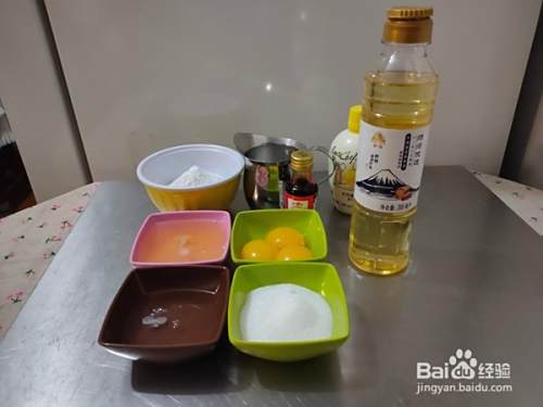 准备好全部的食材,称重准备好,鸡蛋的蛋黄与蛋白分离。